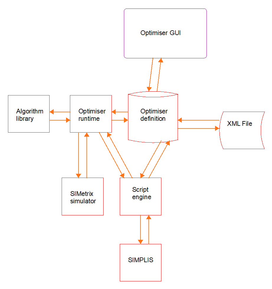 The following diagram shows the structure of the optimiser framework and its interaction with the script language: