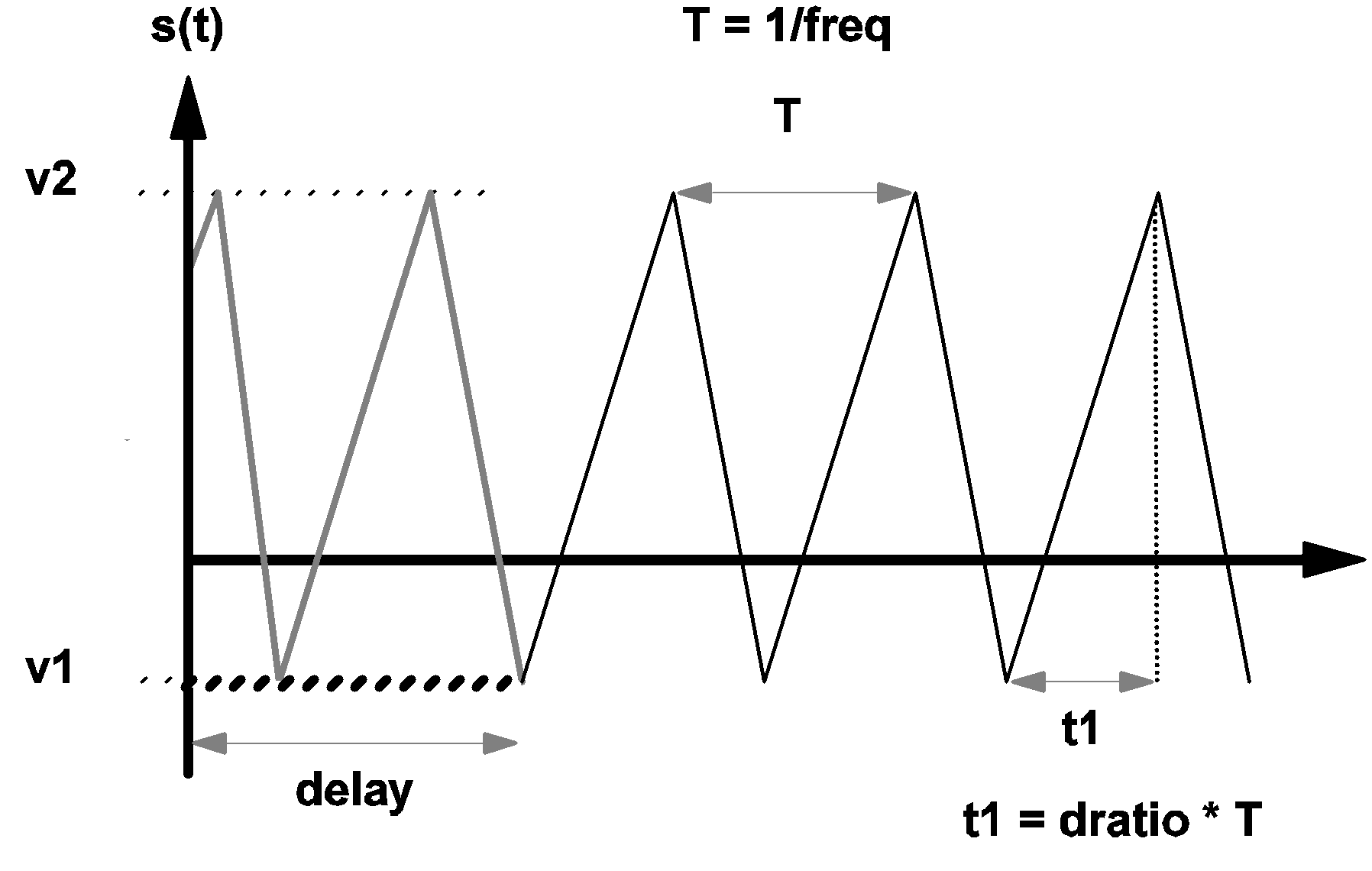 \[ s(t)=v1 for 0 < t < \textit{delay} \text{ and OFF_UNTIL_DELAY=YES.} \] Again, whether the delay is positive or negative, the time-domain transient analysis performed by the simulation always starts with the time variable set equal to 0.0. The diagram below shows the waveform, s(t), of a typical triangular source. For t < delay and OFF_UNTIL_DELAY=YES, the waveform s(t) is shown in bold dashed line. For t < delay and OFF_UNTIL_DELAY=NO, the waveform s(t) is shown in heavy gray line.