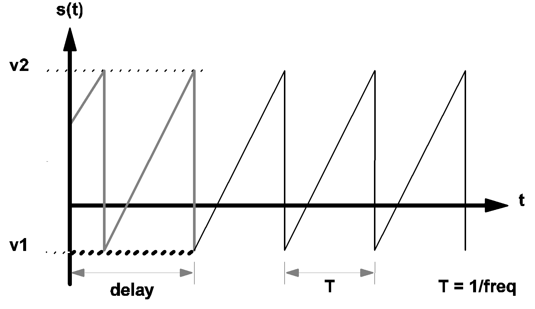 The diagram below shows the waveforms of a sawtooth source. For t < delay and OFF_UNTIL_DELAY=YES, the waveform s(t) is shown in bold dashed line. For t < delay and OFF_UNTIL_DELAY=NO, the waveform s(t) is shown in heavy gray line.