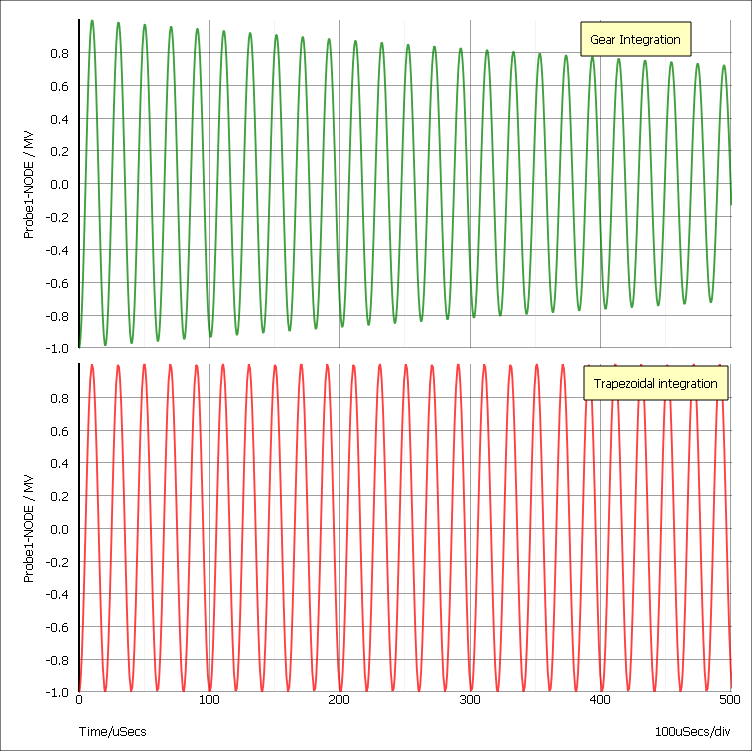 The above curves are the result of simulating a simple LC circuit that is completely undamped. The top trace was the result of Gear integration and the bottom, trapezoidal. The bottom curve is correct and agrees with theory. The top curve is inaccurate. If the analysis was done with Gear integration but with a smaller value of RELTOL, the damping effect would be less, so for all methods the result is ultimately accurate if the tolerance is made small enough. But trapezoidal gives accurate results without tight values of RELTOL.