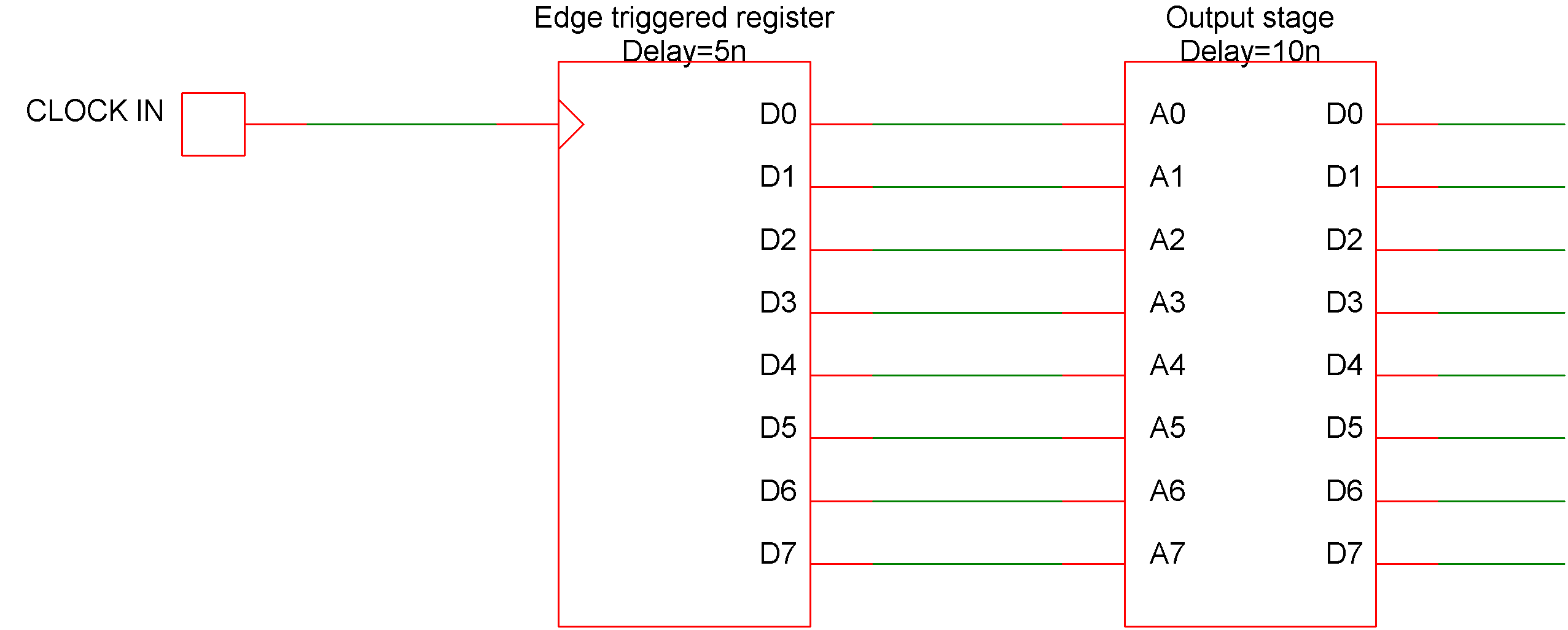 PORT (DELAY = 10n) CountOut out[0:7] ; EDGE (DELAY=5n, WIDTH=8, CLOCK=in[0]) Count ; Count = Count + 1 ; CountOut = count ;