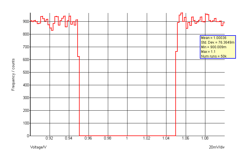 The standard Gaussian distribution functions (GAUSS(), GAUSSL()) return a random variable with a true Gaussian distribution where the tolerance value represents the 3???MATH???\sigma???MATH??? spread. This can return values that are outside the tolerance specification albeit with low probability. For example GAUSS(0.1) can return values >1.1 and less than 0.9 as defined by the Gaussian distribution. For specifying actual components this is not usually exactly correct as most components are tested at production and devices outside the specified tolerance will be rejected.