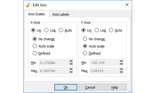 You can edit axis scales, label and units by selecting the graph popup menu Axes > Edit Axis.... This brings up the following dialog box: The function of the Axis scales sheet and axis labels sheet is similar to the sheets of the same name in the define curve dialog box. See Plotting an Arbitrary Expression for details.