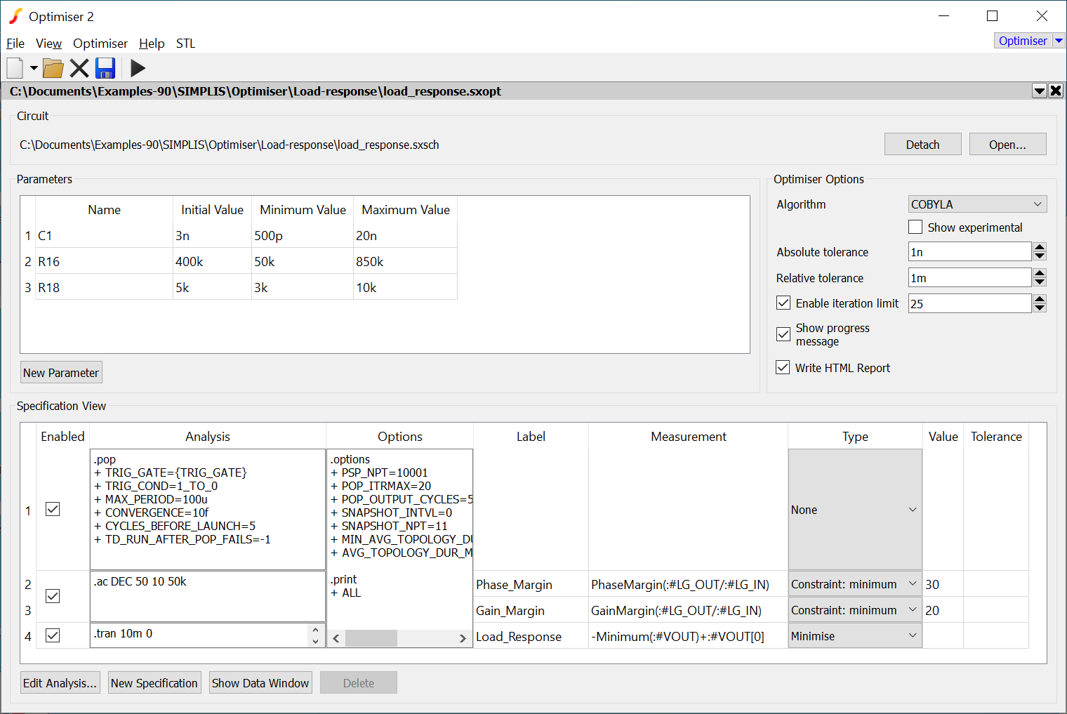 From the examples folder locate the file load_response.sxopt. Typically this will be located at Documents/SIMetrix/Examples-version/SIMPLIS/Optimiser/Load-response/load_response.sxopt. You can drag and drop the file into the SIMetrix environment or open it using menu File > Open... then select Optimiser Files (*.sxopt) in the file selection drop down box then navigate to load_response.sxopt. You should see the Optimiser GUI open with the following setup: