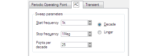 | Points per decade/Number of points | If a decade sweep is selected enter the number of points required for each decade. If a linear sweep is selected enter the total number of points for the analysis. |
