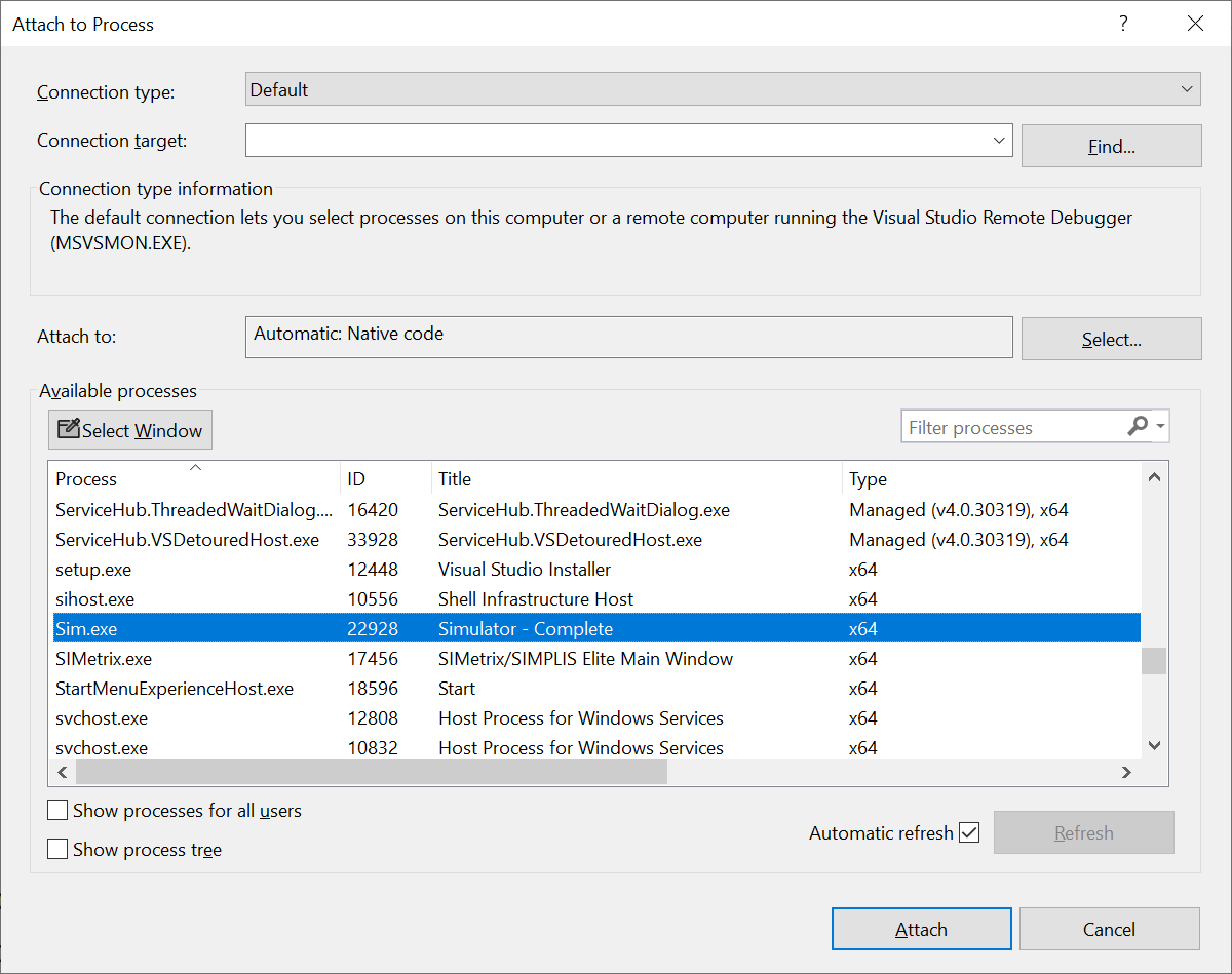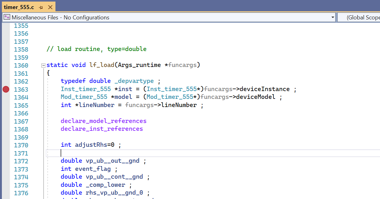 To start a debug session, you first open the 'C' file in Visual studio, then set at least one breakpoint. Next you must attach the Visual Studio debugger to the SIMetrix simulator process which loads the 'C' file. Finally run the simulation until the breakpoint is hit. Here is the detailed procedure for Visual Studio 2022 and 2019. The procedure for older versions is similar but not identical.