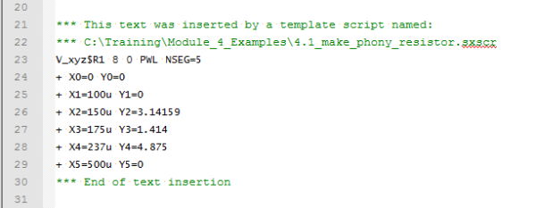 The model used by the resistor in the 4.1_symbols_may_not_represent_what_you_think.sxsch schematic was created with a template script. The script file is located in the schematic's working directory: C:/Training/Module_4_Examples/4.1_make_phony_resistor.sxscr. Creating models with templatescripts is outside the scope of this training course and only a brief introduction will be covered. The Script Reference Schematic Template Scripts has detailed instructions on how to create models using the templatescript method.