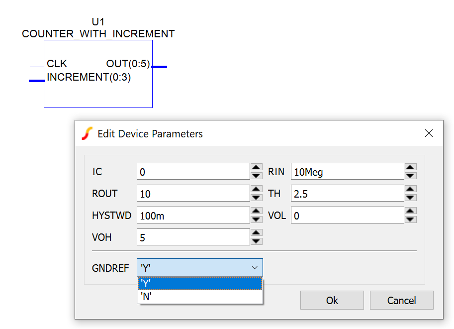 Since our circuit will only contain digital devices, set the "GNDREF" property to 'Y' to enable a GND pin for the device.