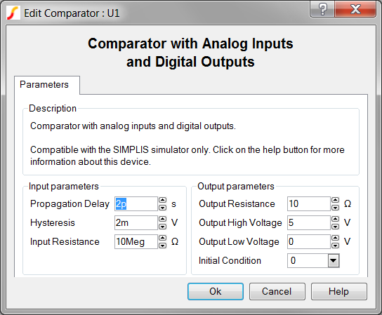 The Comparator with Analog Inputs and Digital Outputs models a generic comparator with hysteresis. The output of the Comparator is treated as a digital signal for the SIMPLIS event-driven simulator only if the output is connected to SIMPLIS digital devices. If the Comparator output is connected to analog devices, the output voltage levels and output resistance are defined by the Output High Voltage, Output Low Voltage, and the Output Resistance parameters.