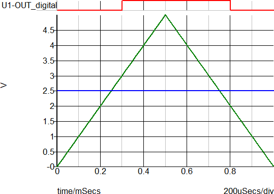 The waveforms below were taken from a Comparator with a 1V Hysteresis parameter, and a slow triangle wave ramp applied to the input. The Comparator output switches from low to high when the ramp reaches 3V and from high to low when the ramp reaches 2V.
