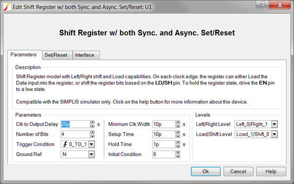 Because the Shift Register with both Sync and Async Set/Reset model is generated by a template script when the simulation is executed, a hand-coded model cannot be inserted into a netlist. The template script for this device is simplis_make_register_model.sxscr, which licensed users can download as part of a zip archive of all built-in scripts.