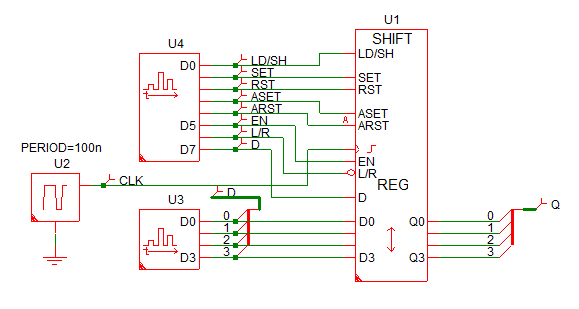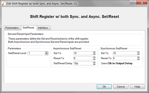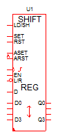 The Shift Register with both Sync and Async Set/Resetkeyword models a combination of a clocked data type register and a shift register. The clock edge for the register can be set with the Trigger Condition parameter to be a rising edge (0_TO_1) or a falling edge (1_TO_0). both asynchronous and synchronous set and reset inputs are provided. The active logic level of the inputs can be configured with the Set/Reset Level and Load/Shift Level parameters.