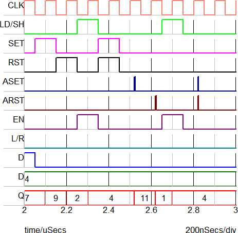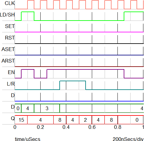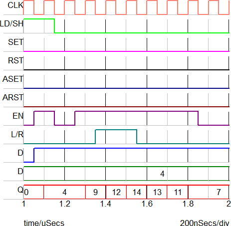The image below shows the load and shift behavior when the D input is 0. During a left shift operation, the D input is shifted into the LSB; since D=0, the new Q output is twice the old Q. For a right shift, the D input is shifted into the MSB; since D=0, the new Q output is half the old Q. The initial condition of the shift register with both async and sync set/reset is set to 15 decimal in the example.