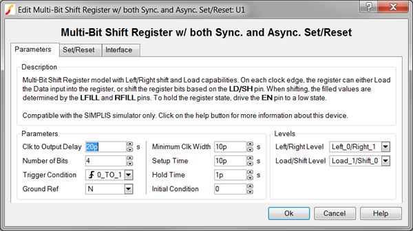 Because the Multi-Bit Shift Register with both Sync and Async Set/Reset model is generated by a template script when the simulation is executed, a hand-coded model cannot be inserted into a netlist. The template script for this device is simplis_make_register_model.sxscr, which licensed users can download as part of a zip archive of all built-in scripts.