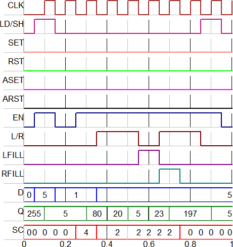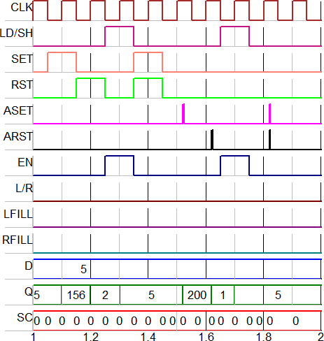 | LD/SH | SET | RST | ASET | ARST | EN | L/R | LFILL | RFILL | CLK | Q | |