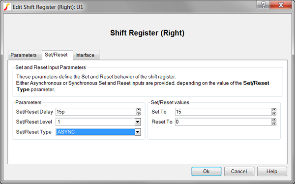 The Shift Register (Right) models a combination of a clocked data type register and a shift register with right shifts only. The clock edge for the register can be set with the Trigger Condition parameter to be a rising edge (0_TO_1) or a falling edge (1_TO_0). The set/reset events can be configured to be asynchronous or synchronous to the clock with the Set/Reset Type parameter. The active logic level of the inputs can be configured with the Set/Reset Level and Load/Shift Level parameters.