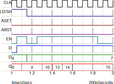 The image below shows the load and shift behavior when the D input is 0. For a right shift, the D input is shifted into the MSB; since D=0, the new Q output is half the old Q. The initial condition of the right shift register is set to 15 decimal in the example.