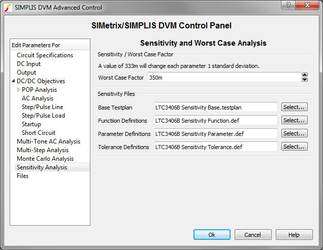 Each scalar value in the above list is automatically generated by DVM and therefore the sensitivity of the scalar can be measured. You can download the DC/DC buck converter example as part of the DVM Tutorial example schematics and supporting files. The converter schematic is located in the LTC3406B directory of the zip archive, and has the filename of LTC3406B Sensitivity.sxsch.