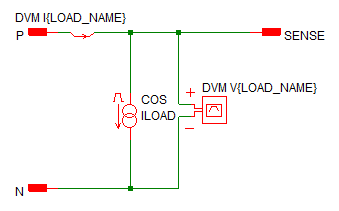 The Cosine Waveform Load subcircuit models a time-varying load with a cosinusoidal current. At time=0, the load begins at the FINAL_CURRENT value and has a cosine function. The Cosine Waveform Load is not used in any test objectives, but you can change any load to a cosine load with a Cos() function call in a Load column.