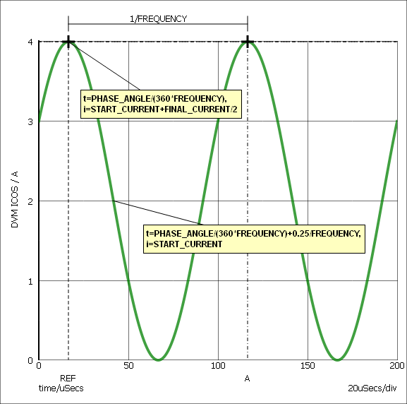 In this example the PHASE_ANGLE parameter is set to 60, and the OFF_UNTIL_DELAY is set to 1; therefore, for simulation times less than the time delay defined by the PHASE_ANGLE parameter, the load current is 2A, which is the value of the START_CURRENT argument.