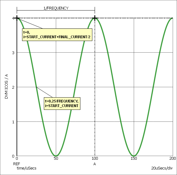 Since the TIME_DELAY parameter is set to zero, the pulse waveform begins with the START_CURRENT + FINAL_CURRENT value divided by 2 at t=0.