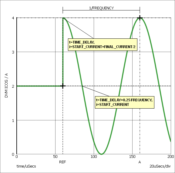 | TIME_DELAY | 10u | Real | min: 0 | s | The delay before the cosinusoid starts. The load behavior before the TIME_DELAY is determined by the OFF_UNTIL_DELAY parameter. |