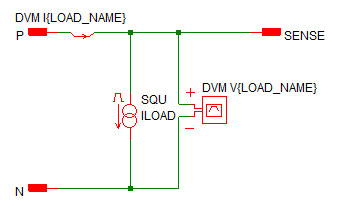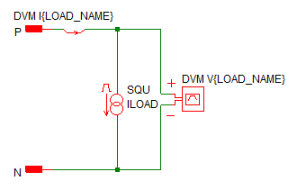 The Square Waveform Load subcircuit models a repeating square wave load current with zero rise and fall times. In DVM, this load is not used in any test objectives, but you can set a load to use this subcircuit with a Squ() call in the Load column of your testplan.