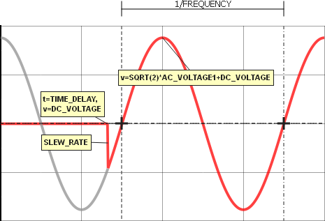 This example uses the optional parameter LINE_PHASEANGLE set to 90°, and a time delay before the source starts. The dotted curve represents the source prior to the startup time, which is set by the TIME_DELAY parameter. For simulation times greater than the TIME_DELAY, the source is a fixed AC sine wave.