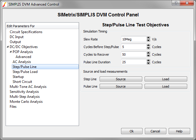 The StepLine() test objective sets the source and load subcircuits to the following: