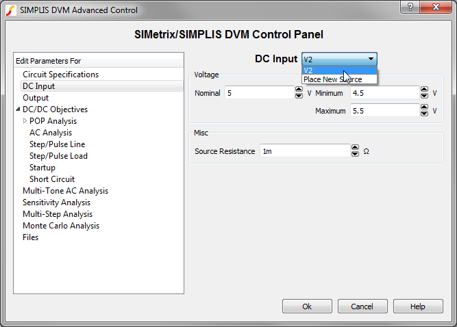 When the Full Power Assist control symbol is added to a schematic which has DVM sources and loads, the existing DVM sources and loads are automatically set up to be managed by DVM for each simulation test. Managed sources and loads have specification information stored on the control symbol. The specifications stored on the DVM control symbol are used by DVM to set the source voltage and load current during a DVM test.