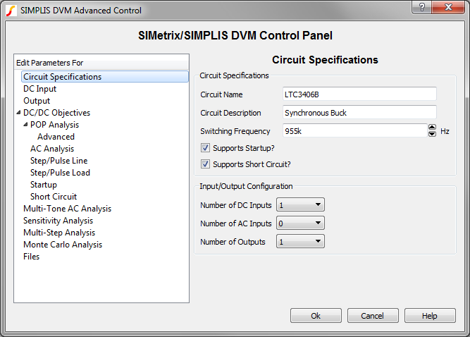 The DVM control symbol has been configured with one managed input source (V2) and one managed output load (I1). When you placed the control symbol on the schematic with analysis directives already set from the Choose Analysis ... dialog, these directives are copied onto the control symbol. Since the program has no way of knowing what the input and output voltages and load currents are, you need to change these parameters to suit this particular circuit.