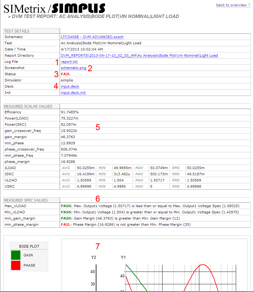 During each test, DVM measures scalar data, such as the converter phase margin, and compares these scalar results with the specifications stored in the DVM control symbol. Each test is assigned a PASS/ FAIL status based on these comparisons. If the same tests were selected as in the example, the overview report should show one test failure due to the minimum phase-margin specification. In the image below, the overview report has been annotated to highlight the common data elements of the overview report.