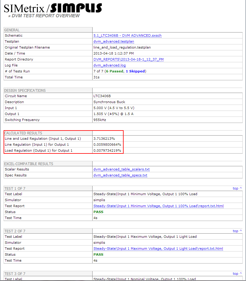 The line and load regulation data are presented in the Calculated Results section of the overview test report as shown below.
