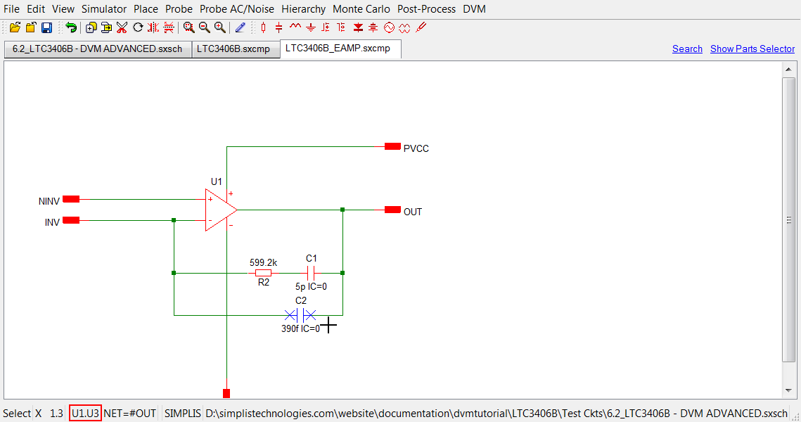 When this testplan is run on the schematic LTC3406B/6.2_LTC3406B - DVM ADVANCED.sxsch from SIMPLIS_dvm_tutorial_examples.zip , DVM descends for each test into U1, then into U3 and changes the component value for C2. The program then ascends to the top level and executes the simulation.
