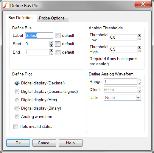 SystemDesigner Bus Probes plot the value of a SystemDesigner Bus in several ways. You can place the output curve on the digital or analog axis or on a grid and on separate graph tabs. Curves from multiple probes can be collected on one analog axis by specifying a common axis name. Likewise, curves can be output to the same graph by specifying a common graph name.