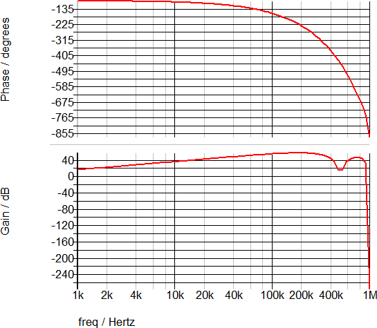 The AC transfer function for the subtractor circuit is shown below. As expected, the transfer function is that of a differentiator.