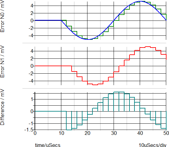 For double-precision floating-point sampled-data simulations, the ADC behaves as a sample/hold and gains the result by 1/BIN_SIZE, which, with a BIN_SIZE of 2mV is a gain of 500. The output of the ADC is therefore a sampled-time analog voltage, but without amplitude quantization. The peak amplitude of the ADC is 5.1mV * 1/BIN_SIZE or 2.55V. Notice the difference between this error and the error for the integer-data simulation. In the integer simulation, the Error N0 signal takes on discrete amplitudes, whereas in the floating point simulation, the amplitudes are not quantized. The ADC output is then input to the unit delay which then delays the analog signal one clock cycle. The subtractor then subtracts the two analog signals and produces the output: Difference = Error N1 - Error N0.