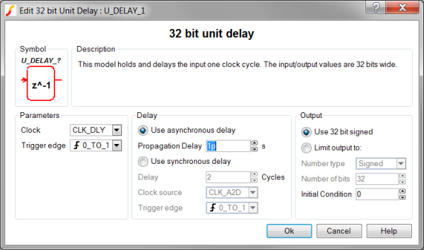 | Delay | The propagation delay from an input change to an output change in number of clock cycles. The output will not change until the number of clock cycles has been reached. The output will then change state only on the selected Clock source edges specified by Trigger edge . This parameter is used only in models with Synchronous delay. |