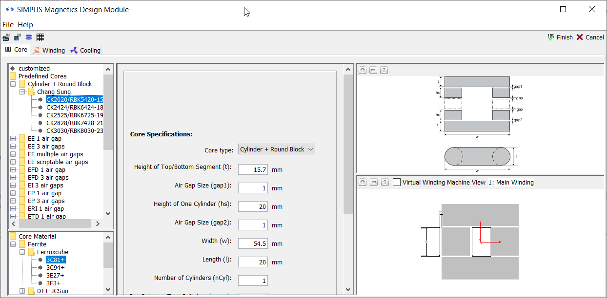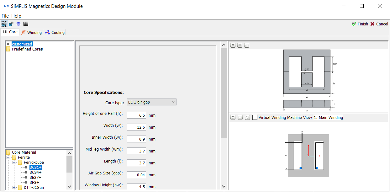 In the top left corner of the MDM main window's Core tab that is selected by default, you will see a selection menu tree with predefined magnetic core shapes and geometries. Since no Level 2 model exists for L1, the first core in the list is selected by default. Below this selection menu tree, in the lower left corner, is another selection menu tree for magnetic core materials. The first material in the core materials list is also selected.