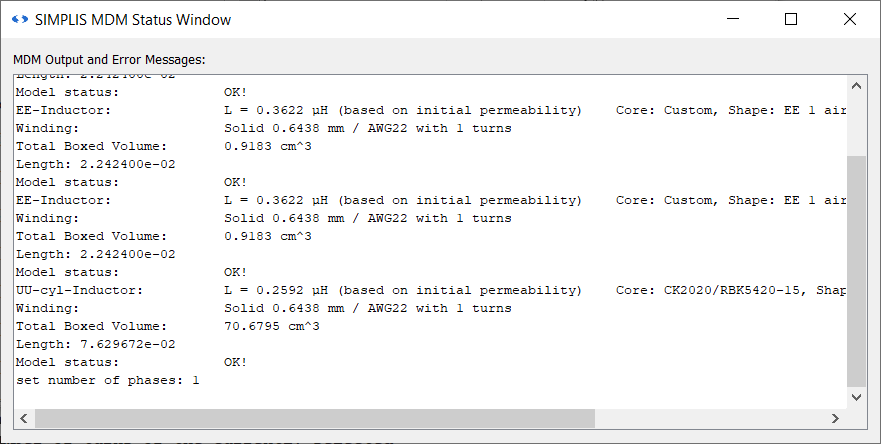As you interact with the main MDM design window, status and error messages are printed to the MDM Status Window. There are two pieces of information which are the most useful to you at this point. The first is the lineage showing the current model status. If it displays "Model status: OK!" as above, then the currently defined model is a physically valid inductor design. Important note: this does NOT necessarily mean that your inductor satisfies your design requirements. That is up to you to determine. It only signifies that the inductor model as currently defined is something that can, as far as MDM knows, be built. If the model status is not "OK!", an error message will be displayed, for example notifying you that the currently specified number of turns of the currently selected wire cannot fit in the winding window of the currently selected core.