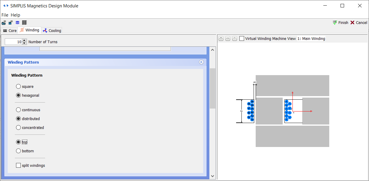 5. Since this is a two-legged core, you can split the winding across the two legs. Check the split windings box at the bottom of the Winding Pattern sub-panel.