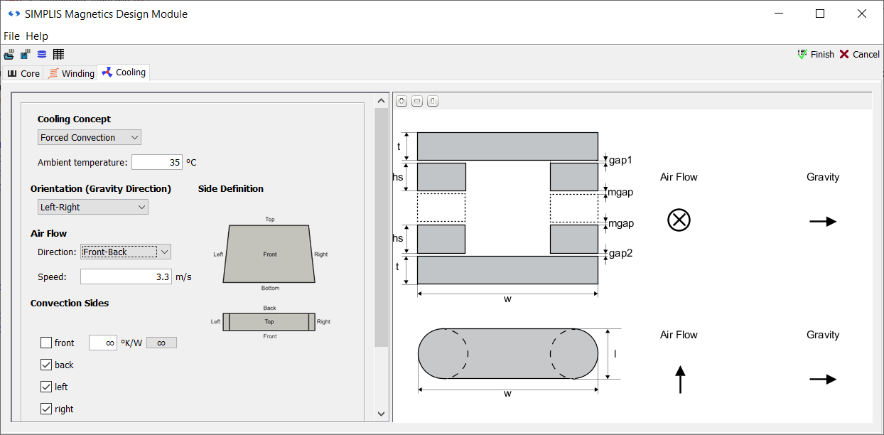 2. The Orientation (Gravity Direction) defines how the inductor is oriented compared to the direction of gravity. In the right panel of the tab you can see a diagram of the core from the front and the top, and beside that the air flow and gravity direction relative to the core. The Orientation is set for both natural and forced convection. Change the Orientation to Left-Right in the drop-down menu.