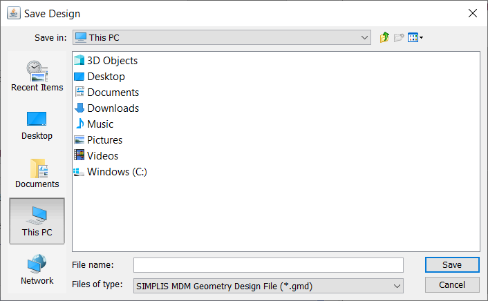 You can save a SIMPLIS Geometry Design File to disk, to an actual file with extension .gmd. To do this,