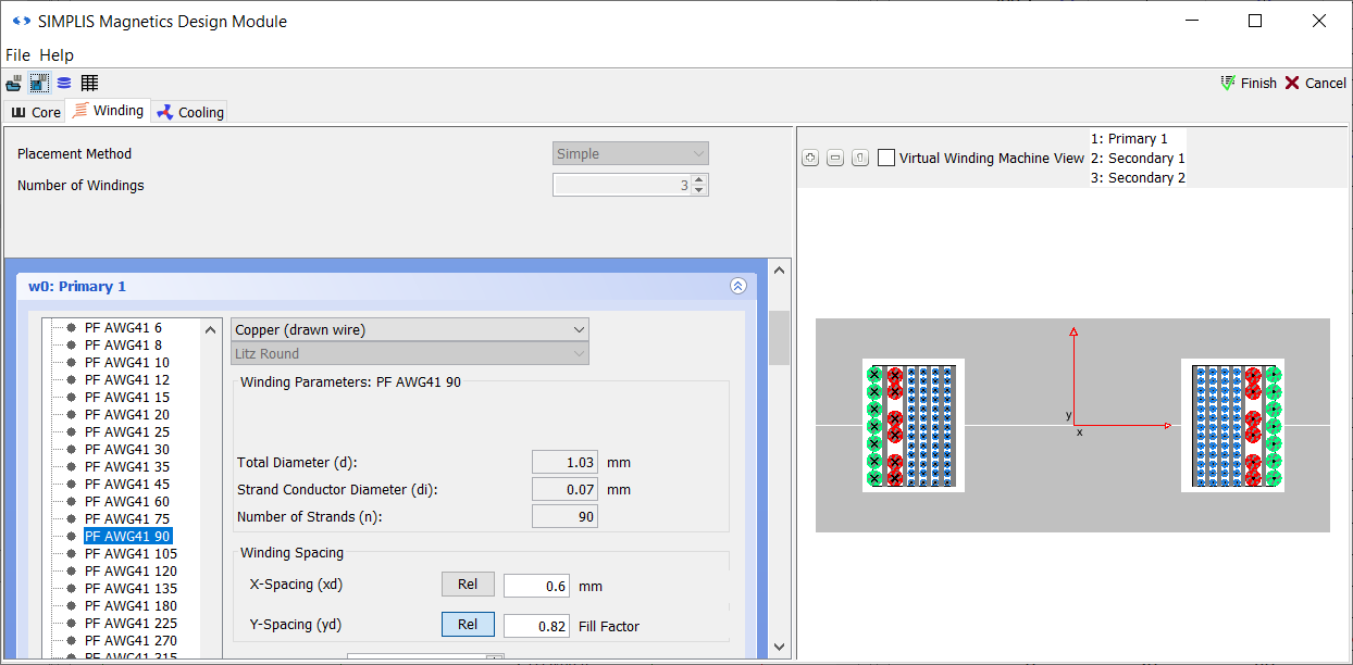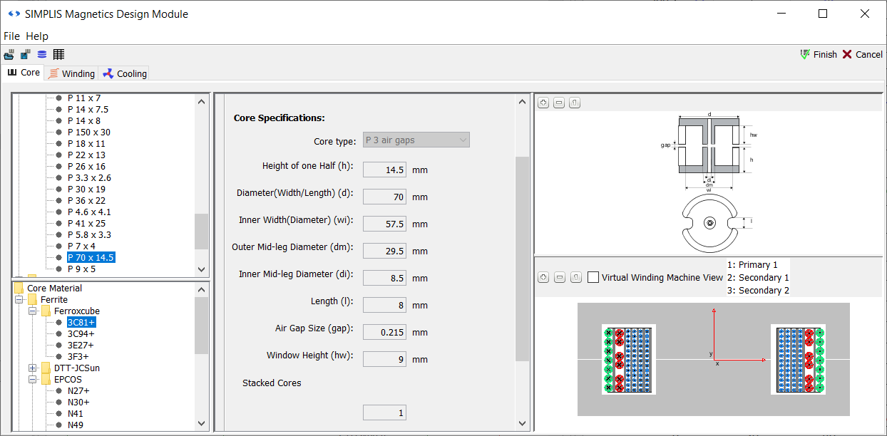 You can see that this design uses both a different core material - Ferroxcube 3C81+ - and different core. A three-gap pot core, P 70 x 14.5, is used, where the air gap on each core leg has been set to 0.215mm. If you look at the Status Window, you will see that this transformer has a magnetizing inductance of 6.6073mH.