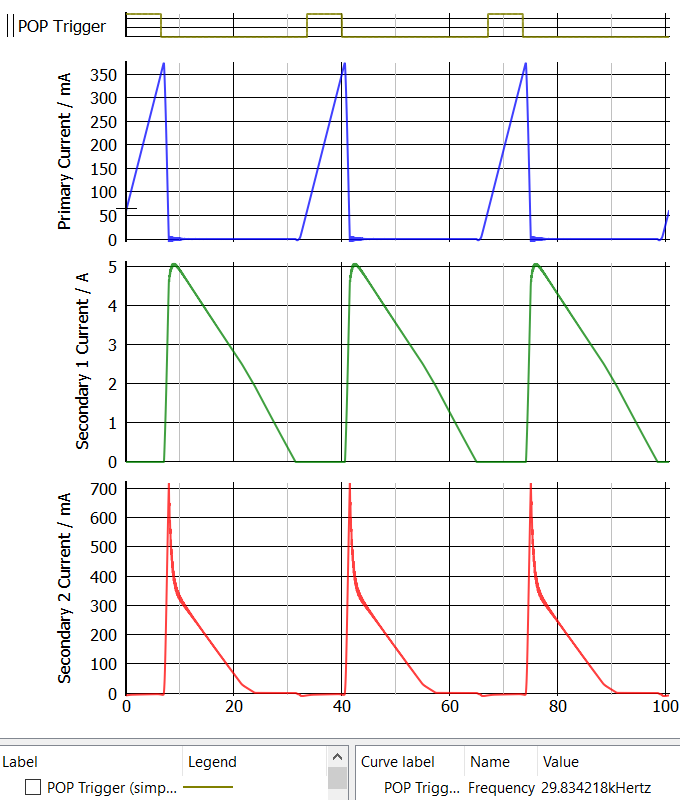 Press F9 to run the simulation. A new MDM Results Window will appear. However, if you look at the Waveform Viewer, you will notice that now, due to different transformer design, the switching frequency has increased to 29.83kHz:
