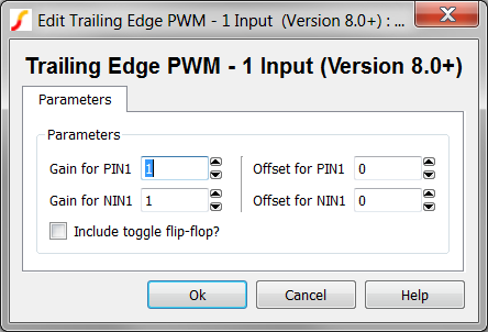 | Include toggle flip-flop? | Adds a toggle flip-flop to the PWM. See the Examples. |
