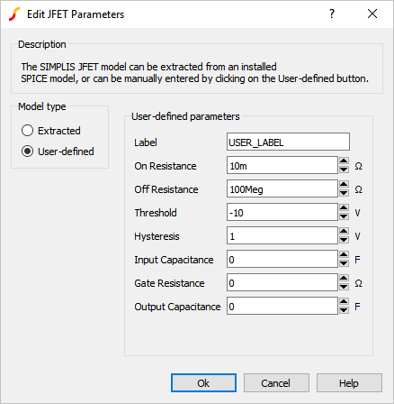 The user-defined model uses parameters entered directly in the Edit JFET Parameters dialog without invoking the model extraction algorithms. A JFET can be switched from an extracted model to a user-defined model at any point; however the extracted parameters are by default copied over to the user-defined parameters, replacing any user-entered values. You can disable this behavior in the SIMPLIS Options dialog by clearing the check box labeled "Automatically copy extracted parameters to User-defined parameters." You can access these options from the command shell menu File > Options > SIMPLIS Options... . For more information, see SIMPLIS JFET Options.