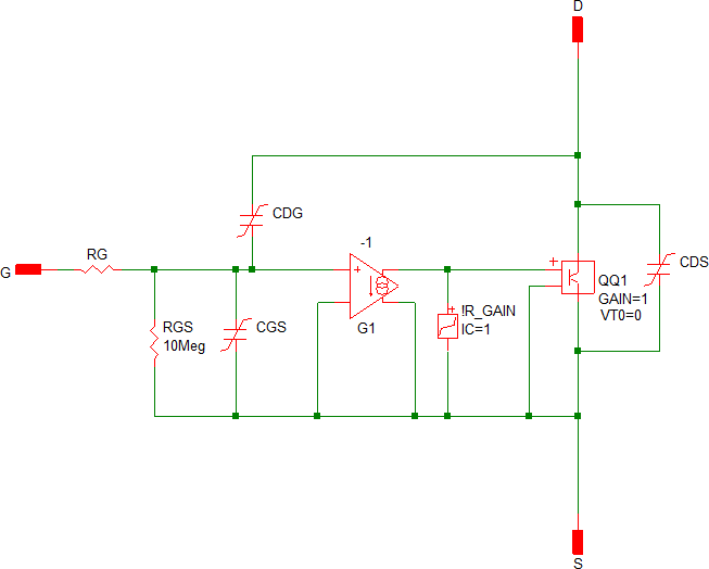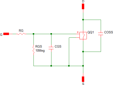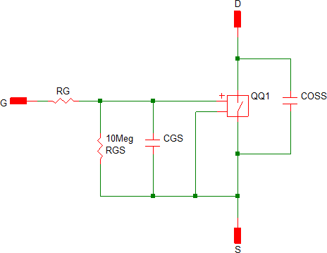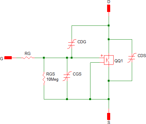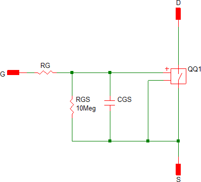 • CGS capacitance is modeled with a linear capacitor and has a parallel 10Meg resistor.