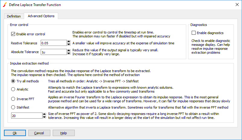 | Analytical | Matches the Laplace transform to known analytical solutions. For example ???MATH???\frac{1}{\sqrt{}(s)}???MATH??? has the impulse response of ???MATH???\frac{1}{2.\pi\sqrt{t}}???MATH???. SIMetrix will automatically detect this and other known Laplace transforms. |