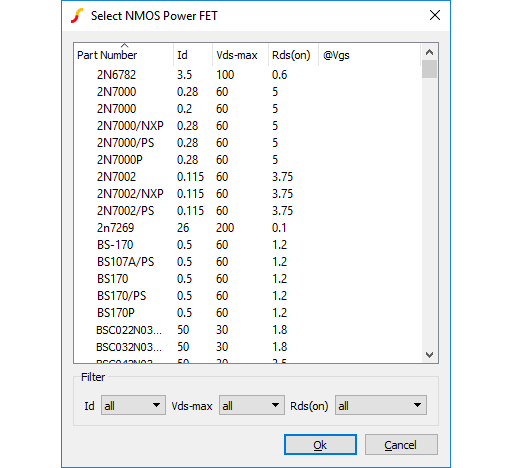 1. Select one of the menus listed under Place > Select by Specification. You can also access this feature using the Part Selector. The picture below show what you would see if selecting NMOS Power FET